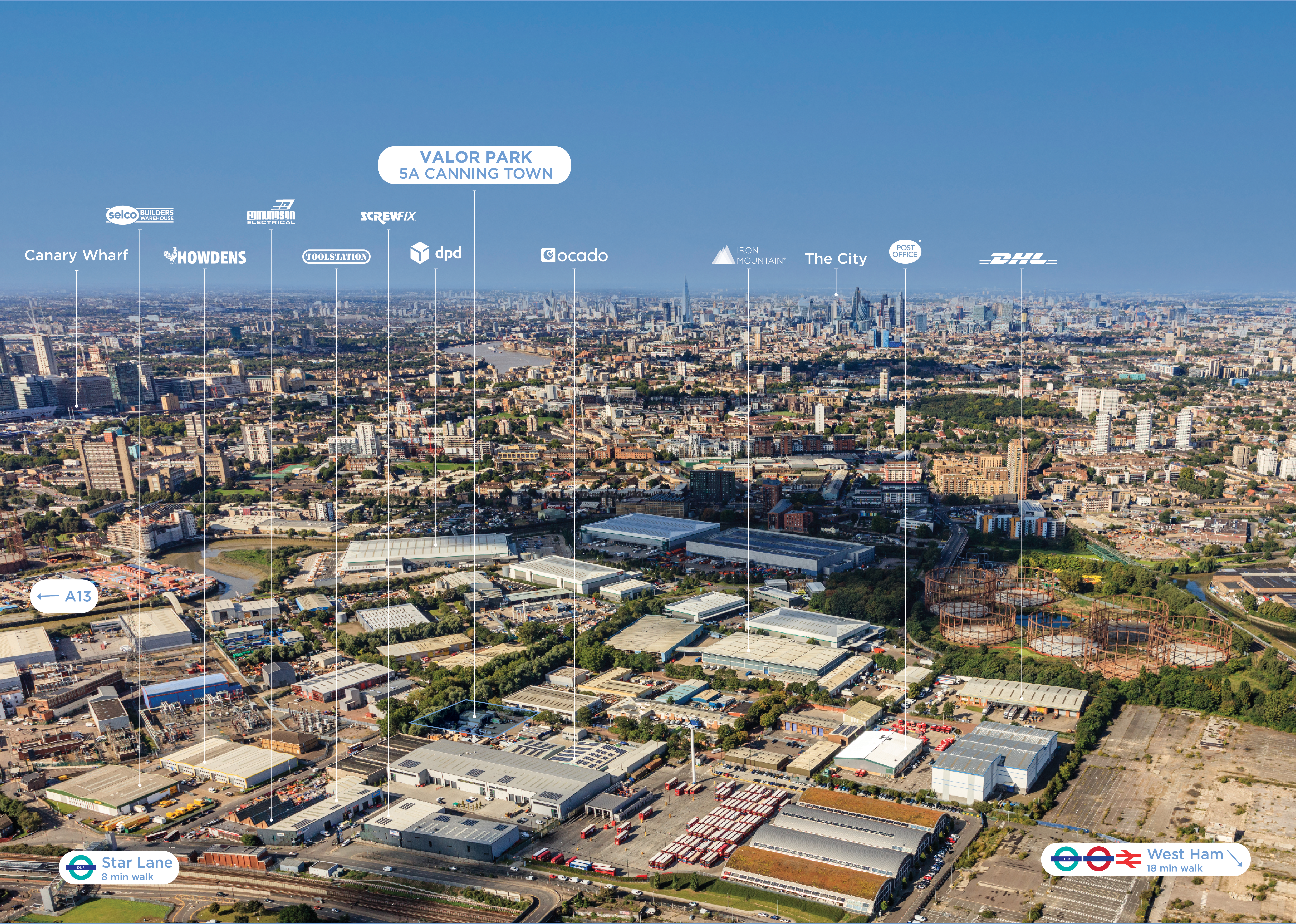Valor Park 5A Canning Town occupies an unrivalled location, close to Canary Wharf and London City Airport, as well as being bordered by the A12 and A13, connecting it directly to central London. It is also within close proximity to Star Lane station (DLR), Canning Town station (Jubilee Underground and DLR) and West Ham station (DLR, Jubilee Underground & National Rail) allowing easy access for employees on the estate. Canning Town is home to a range of established local occupiers such as Selco, Howdens, Edmundson Electrical, Tool Station, Screwfix, DPD, and DHL.